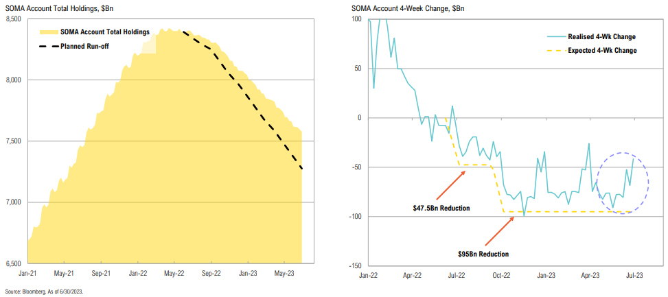 The Fed slowed its balance sheet reduction in June as just $41 billion rolled off over the month, potentially due to Treasury restarting new debt issuance; SOMA account runoff is currently ‘behind’ by >$300bn