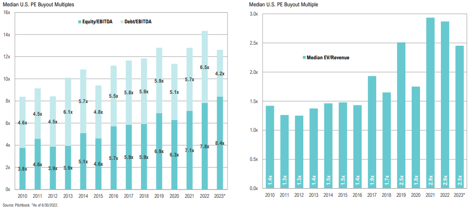 Median equity share in new buyout deals is now over 60% for the first time since the GFC; higher equity share indicates increased price risk and an inability to tap into debt markets