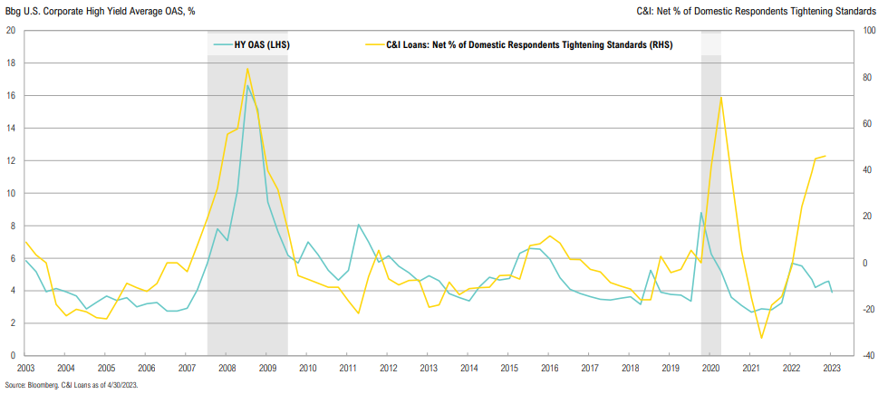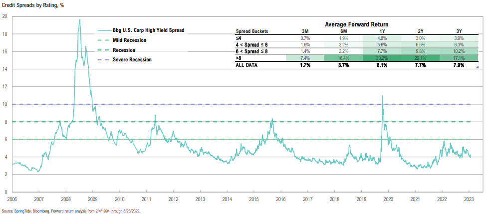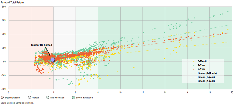 Historically, high yield spreads above 6% have resulted in above-average forward returns; high yield spread is currently trading at a middling 4.0%