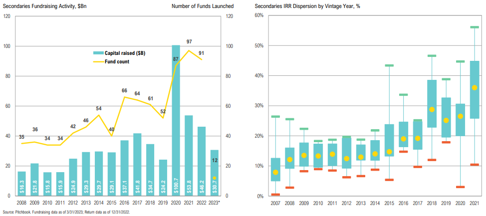 After record years in 2020 and 2021, secondaries fundraising fell back to its historical average in 2022