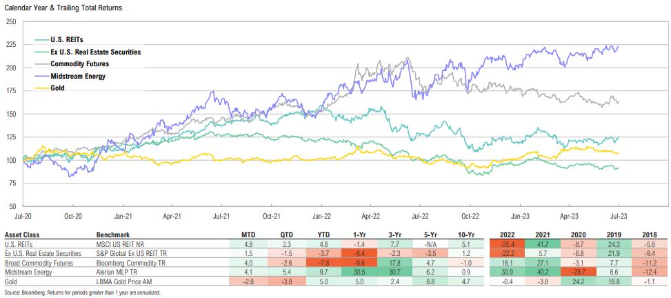 Gold continued its recent correction, declining 3.8% over the quarter; despite weaker oil prices, midstream energy posted another positive quarter, adding 5.4% to its respectable YTD performance