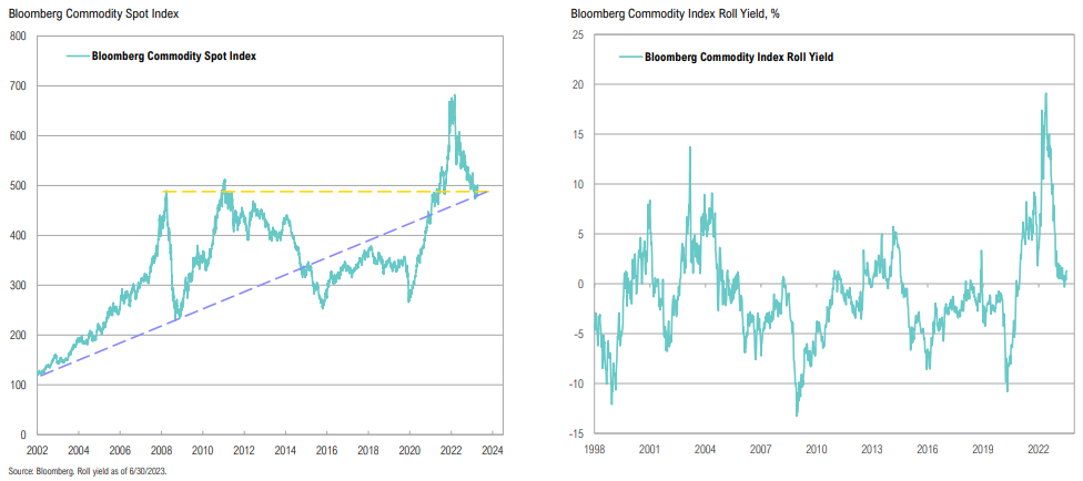 Commodity roll yields have dropped sharply, currently at 1.3%, largely due to natural gas futures shifting back to contango, suggesting global commodity markets have loosened; crude remains in backwardation