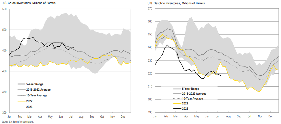Crude has started to rebuild inventory, and is now just above the 5-year average; gasoline inventories are still well below historical average levels