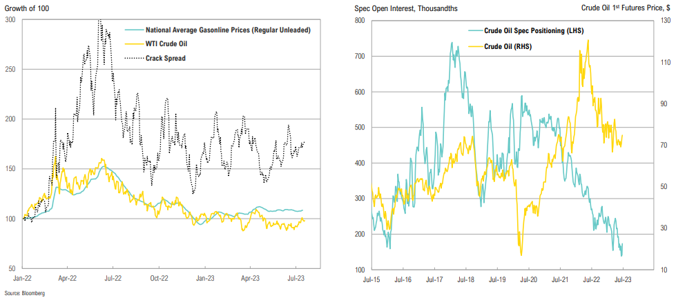 Crack spreads remain elevated despite lower oil prices, signaling continued constrained refinery capacity; YoY gas prices likely bottomed in June and may start contributing to headline inflation by Q4
