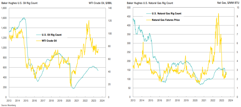 Oil and natural gas rig counts continued to decline over the quarter as uncertainty continues; U.S. oil rig counts are down 14% from 2022 peaks, Nat Gas rigs are down 20%