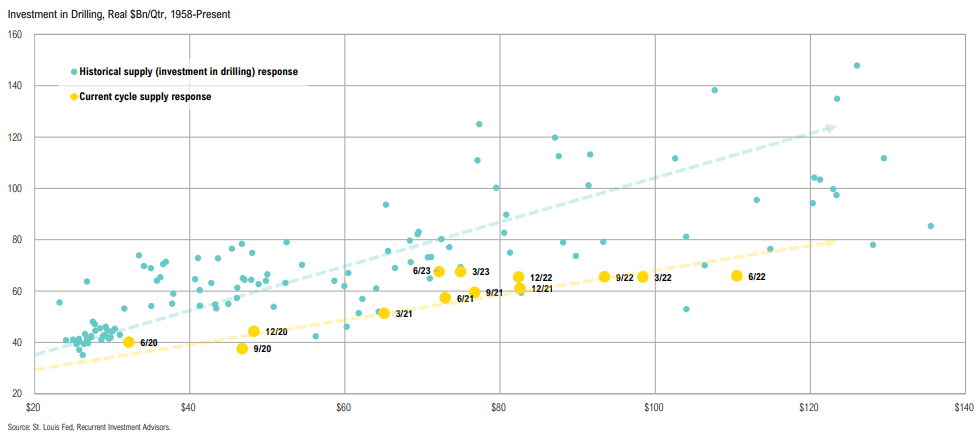 Since COVID, drilling capex levels have been near the bottom of a 65-year range