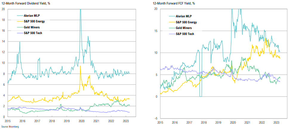 Positive-carry policy hedge – Midstream energy, gold miners and commodity futures now have positive yields (carry) and may provide a hedge if the Fed eases before justified by the data. Conversely, these hedges may underperform in a severe recession.
