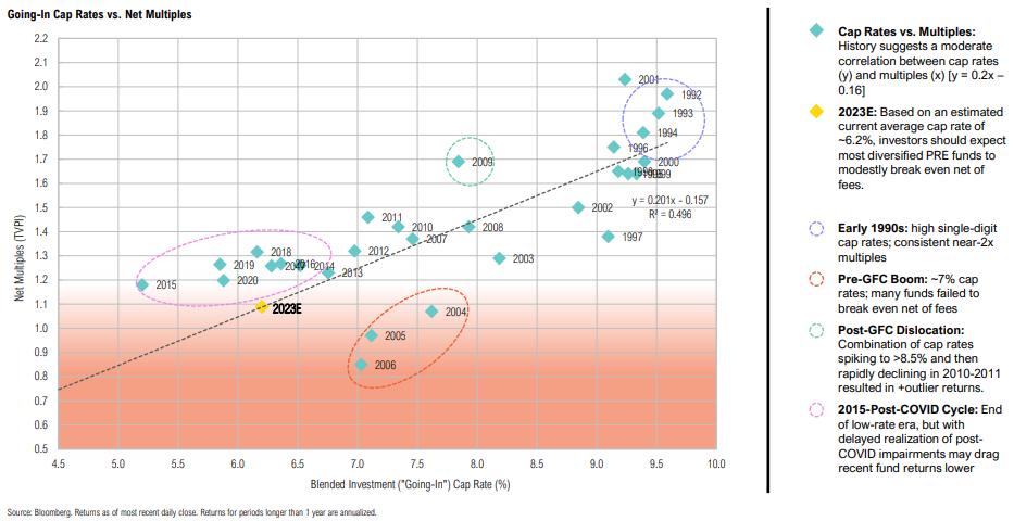 PRE: Longer-term (lagged) returns for various private real estate markets show the impact of going-in cap rates on subsequent returns