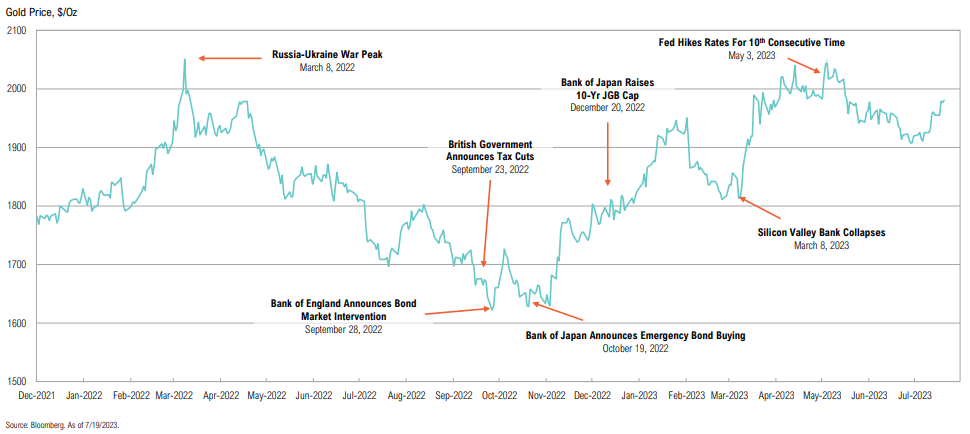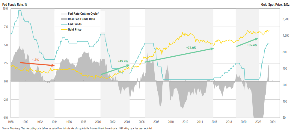 Since the turn of the century, the end of hiking cycles has been positive for gold; this may be due to lower opportunity costs (falling real rates)