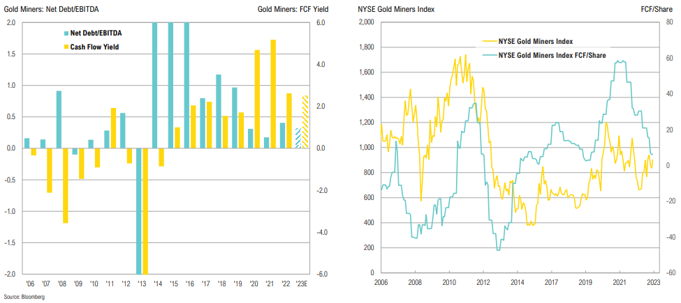 Gold miners have rallied 50% from Sept ‘22 lows, but have sold off modestly in recent months on weaker spot prices; increasing operating costs remains a key risk for miners