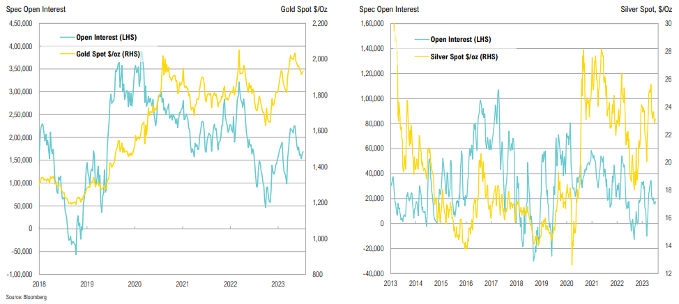 Spec positioning in gold futures has pulled back modestly since May with spot prices declining; positive trend of prices and positioning since Sept. ’22 remains, but there are currently no strong signals
