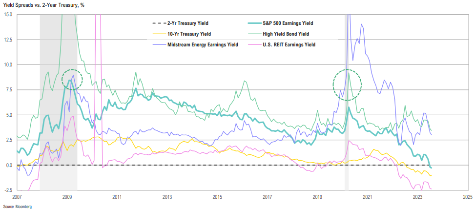 Most asset classes don’t look attractive relative to the 2-year Treasury yield; spreads have some way to go if past recessions are at all indicative