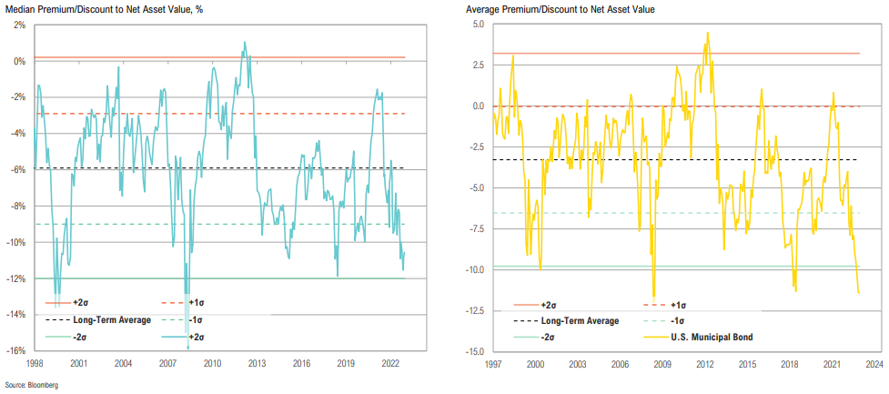 CEF discounts narrowed over the quarter and are currently at -10.8%; U.S. muni bond funds have seen discounts widen further, with an average sector discount of -11.4%, near record levels