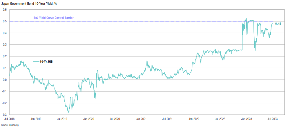 10-Year JGBs seem to have been behaving better since the start of the new BoJ governor Ueda in April; have been below YCC level of 0.5 since mid-March