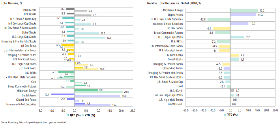Major winners over the quarter included midstream energy and commodities; U.S. large cap stocks and intermediate-term bonds ended the quarter down 3.3% and 3.2%, respectively