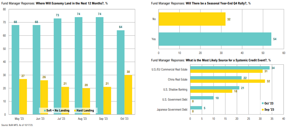 Consensus is for a soft/no landing, a Q4 seasonals rally and a CRE credit event, if one occurs at all, implying limited upside if soft landing occurs and plenty of room for markets to be disappointed