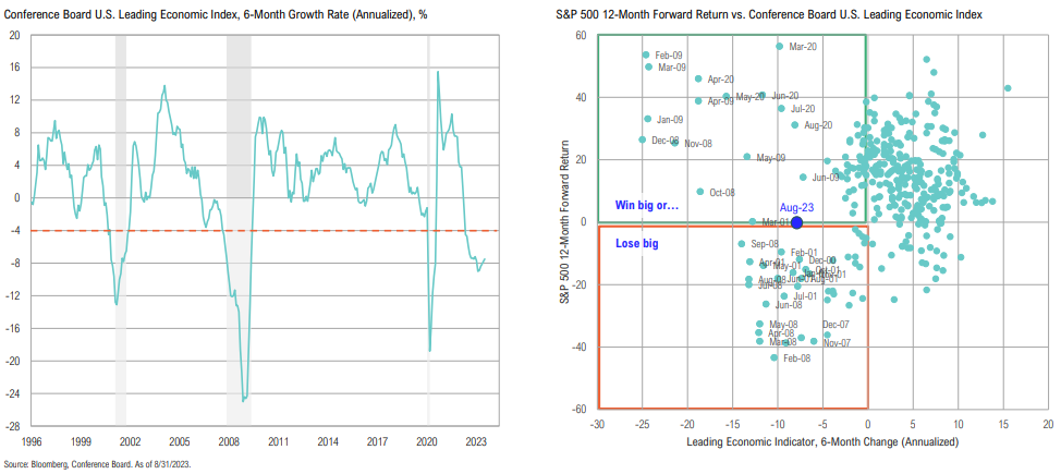 The Conference Board LEI still signals “brief but mild recession” and weak future economic activity; S&P 500 returns when the LEI is at these levels tend to exhibit volatile win big/lose big dynamics