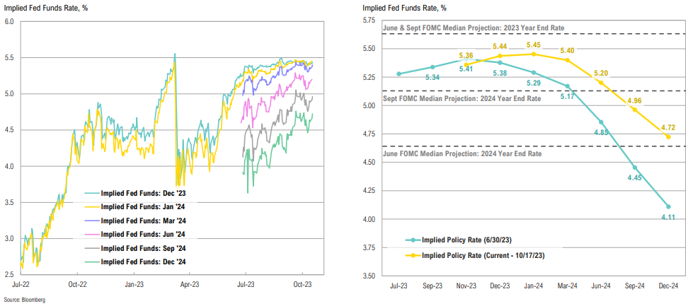 Implied Fed funds shifted higher following the September FOMC meeting as ‘higher-forlonger’ became entrenched; most Fed officials anticipate one more hike before year end