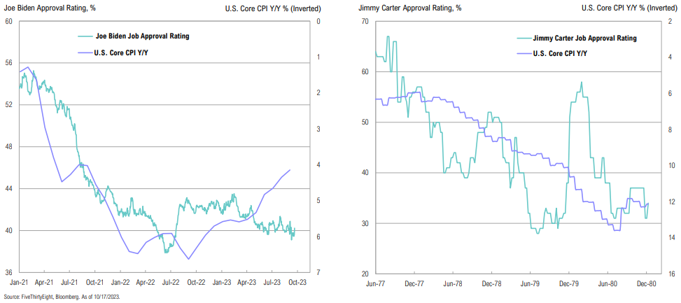 Biden’s approval rating has been linked to consumer inflation and gas prices; the current macro and economic backdrop has parallels to the Carter era