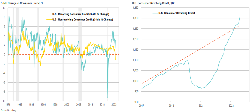 Nonrevolving consumer credit (including student loans, mortgages and other personal loans) is negative for the first time since the GFC; revolving credit continues to climb