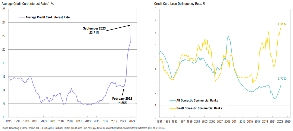 Average credit card interest rates are at an all-time high and while credit card loan delinquency rates are low overall, they are at record-high levels for small banks (red flag)