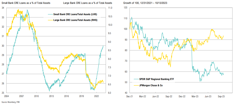 Another red flag for small banks: CRE loans account for 30% of small bank assets and only 6% of large bank assets; big bank performance since Jan 2022 emphasizes their strength