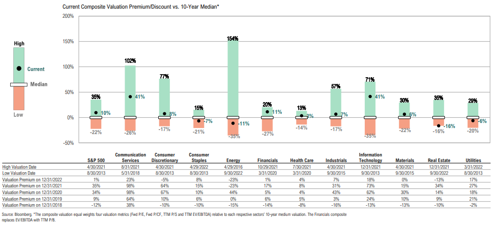 Most S&P 500 sectors are trading at premiums to their median valuations with tech and comm. services looking stretched; energy and real estate offer value relative to their ranges