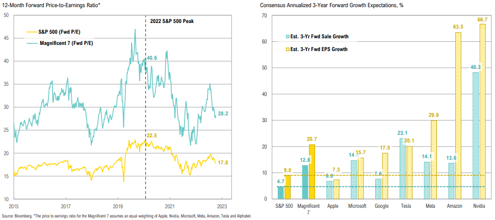 Despite market gains, Mag 7 forward valuations have dropped 30% since 2021 as EPS estimates have risen; Apple is currently trading at 30x earnings, despite single-digit growth expectations