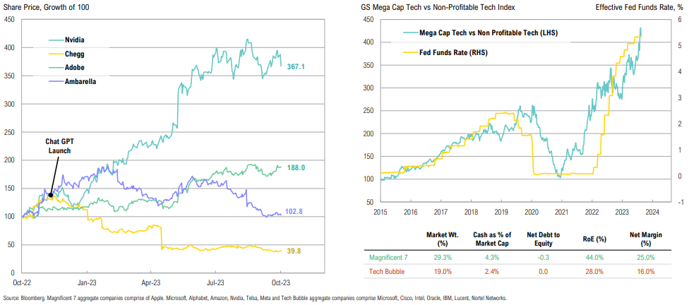 AI ‘winners’ and ‘losers’ are not always obvious; while we believe Mega Cap Tech is overvalued relative to rates, this is not a repeat of the Tech bubble