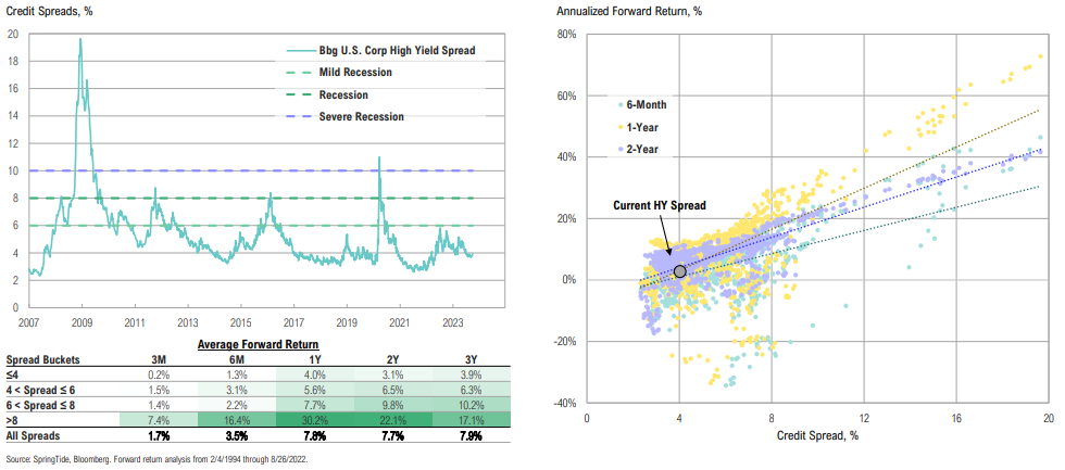 Tranching in high-yield bonds: some spread levels to consider are 6%, 8%, and 10%, with the goal to have each tranche be incrementally larger; current spread is 4.0% (HY spreads above 6% = above-average forward returns)
