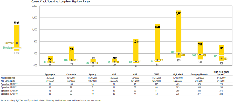 Credit spreads are at or below median across most sectors; while a recession still seems probable based on LEIs & manufacturing data, HYB spreads at current levels don’t corroborate that view