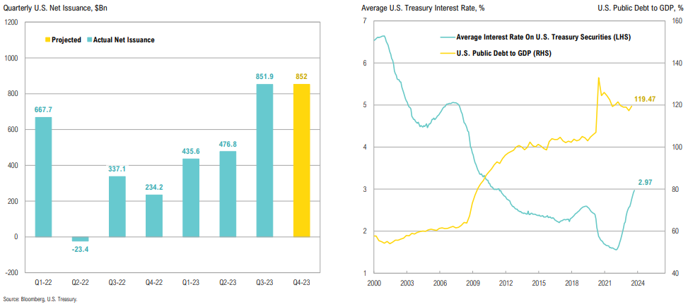 Q3 issuance was less than the anticipated $1tn, with Q4 issuance expected to be $852bn (and largest on record ex-2020) while the cost of outstanding debt continues to climb, now near 3%