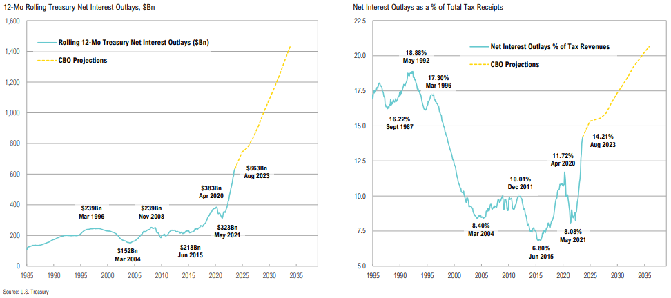 Treasury net interest outlays have climbed to $633bn, with debt outstanding increasing by $500bn over the past month; net interest outlays are expected to accelerate over the next decade