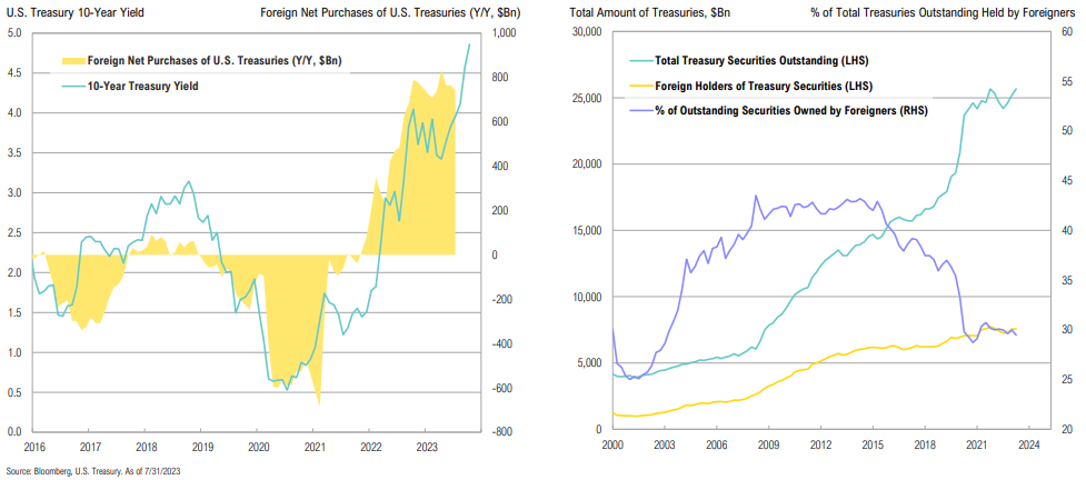 Foreign ownership of Treasuries has waned significantly since 2015 (while foreigners are still buying, they’re buying much less proportionally)