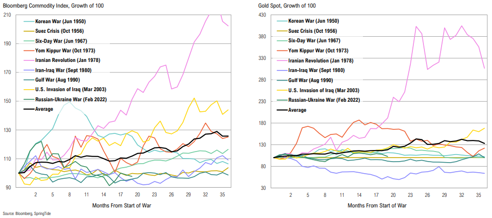 Commodities and gold tend to perform relatively well during wars and periods of general geopolitical stress