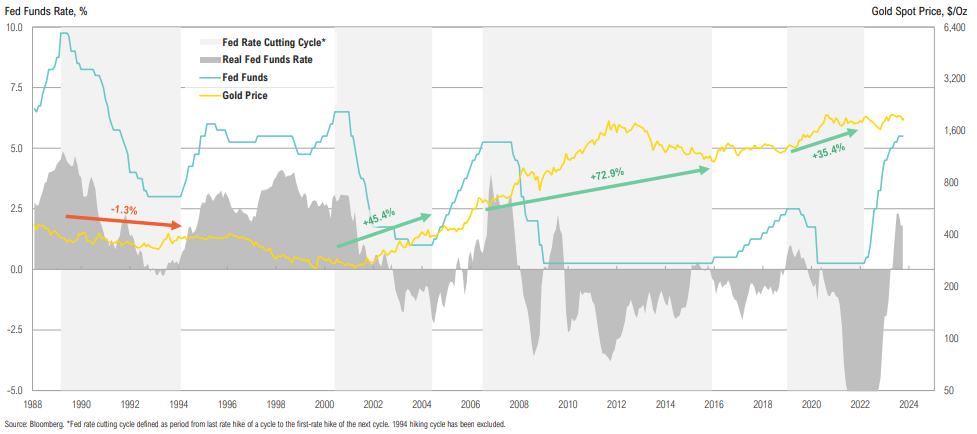 The end of hiking cycles has tended to be positive for gold as the prospects of rate cuts reduce opportunity cost and the Fed tends to cut into a deteriorating deficit