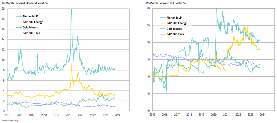 Midstream distribution yields trended lower as the sector broke out to upside but remains stabilized around an attractive 8%; free cash flow yields of the energy sector have declined