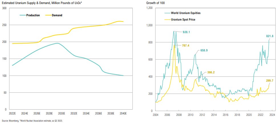 Long term forecast point to uranium demand outpacing supply over the next two decades; uranium equities have outperformed during uranium bull markets