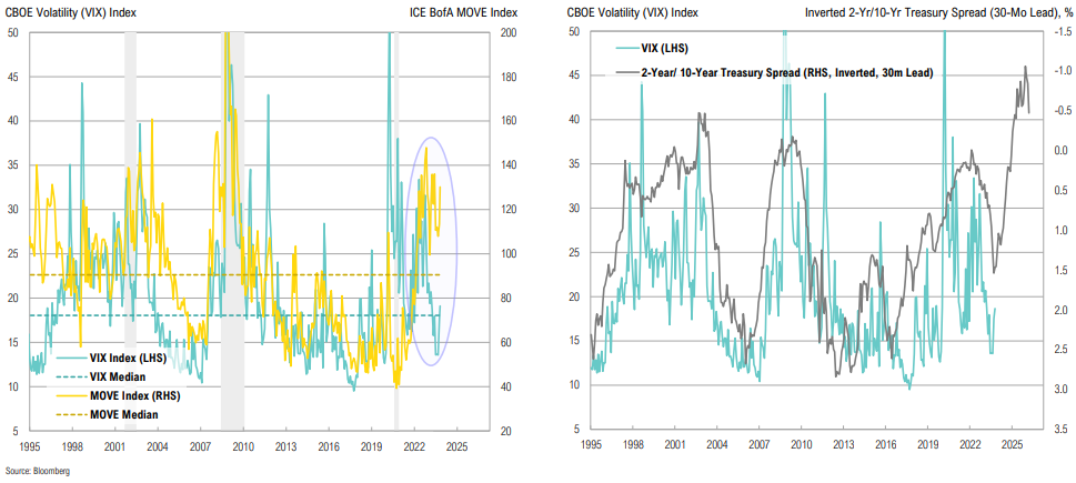 The implied bond market volatility (MOVE) isn’t showing the same level of composure as equities (VIX) and it’s unlikely that both markets are correct; 2s10s spread has historically lead equity volatility by 30 months