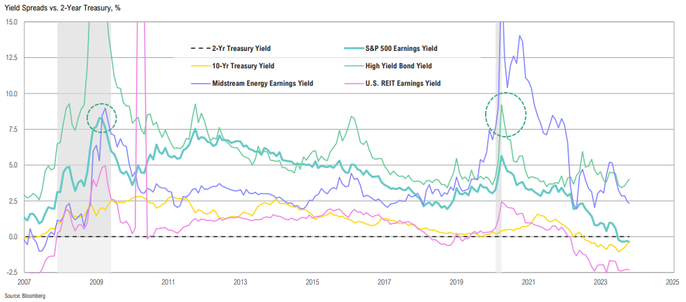 Most asset classes don’t look attractive relative to the 2-year Treasury yield; spreads have some way to go if past recessions are at all indicative