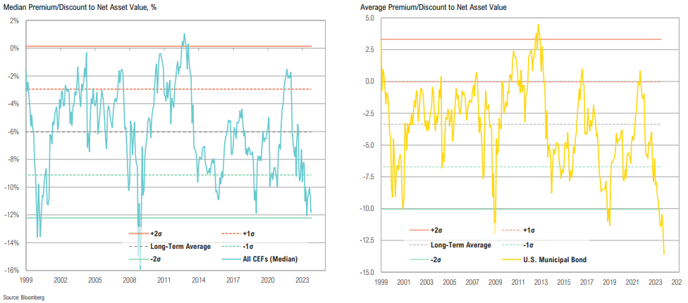 Median CEF discounts remain wide at -11.8%; U.S. Muni CEFs are trading at a 13% discount to NAV, the largest month-end discount since at least 1999…