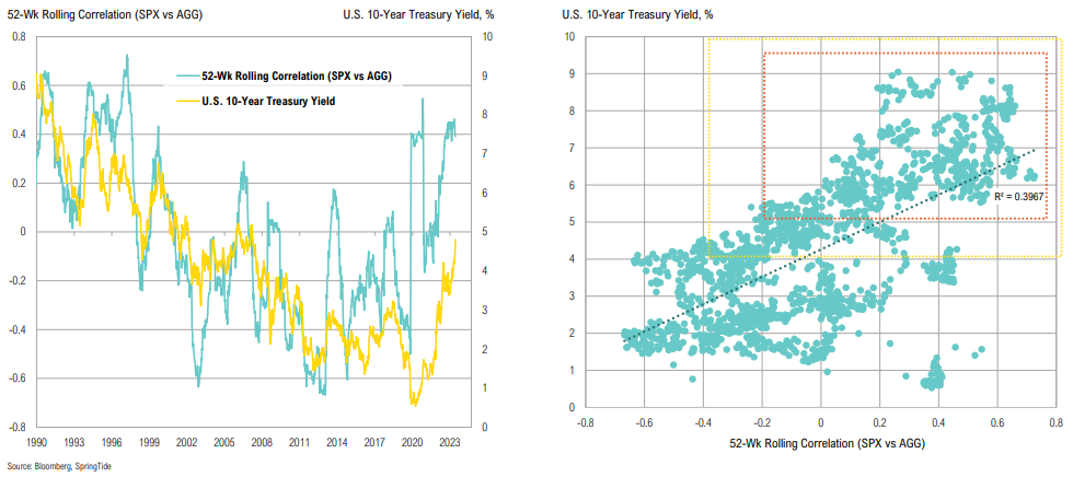 With yields near the crucial 5% threshold, markets are at a key inflection point in terms of stock-bond correlations