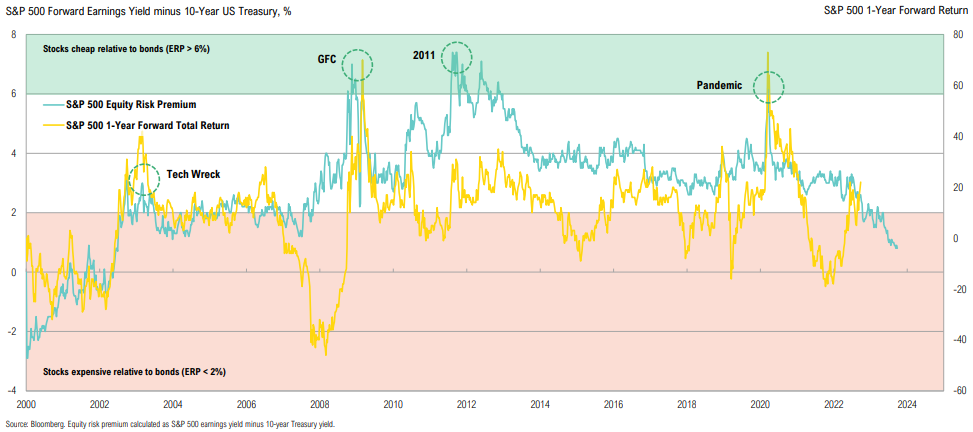 Using a simple yield-to-earnings-yield comparison (ERP), U.S. stocks are less attractively priced vis-à-vis bonds than at any point since the Tech Bubble and its subsequent unwind