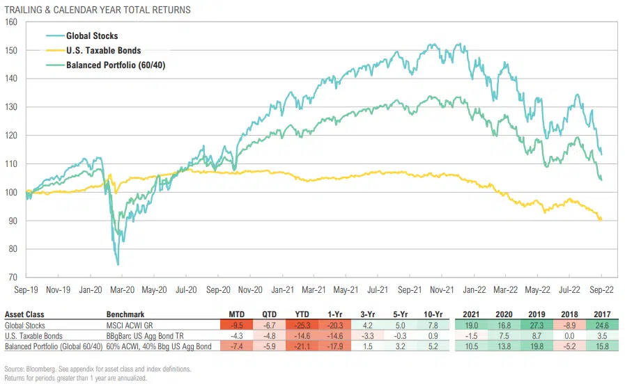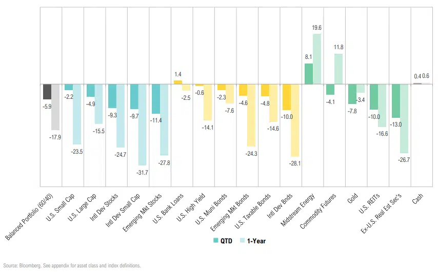 Global stocks closed the quarter down -6.7% while U.S taxable bonds were -4.8% weaker; balanced portfolios returned -5.9%