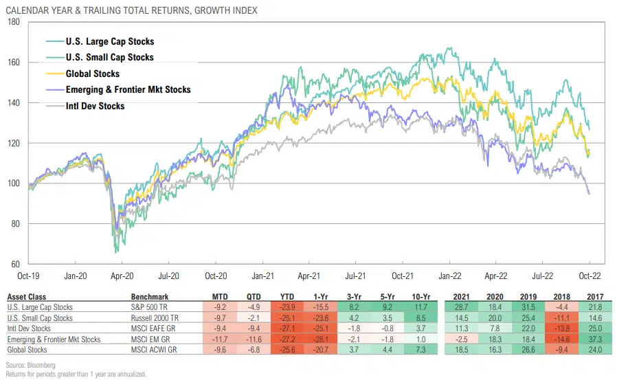 Despite dropping back into bear market territory, U.S. stocks have outperformed their international peers this year; EM underperformed over the quarter