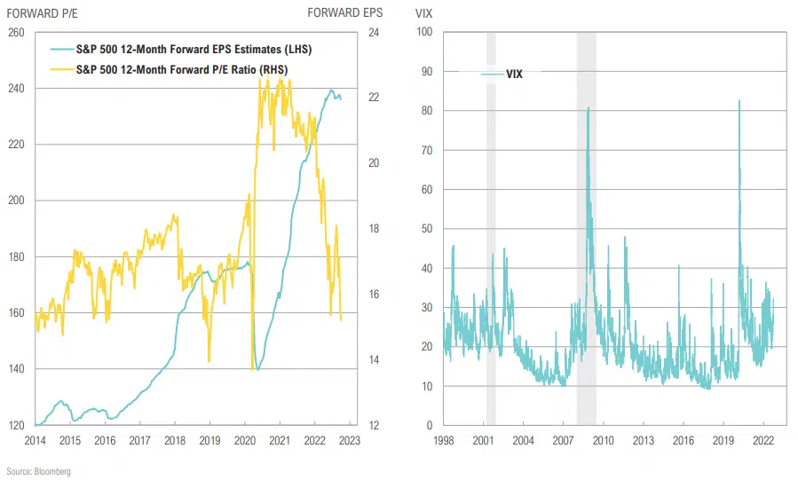 Lower equity prices have helped ease valuations; implied volatility was contained for most of the quarter but ended the quarter back above 30