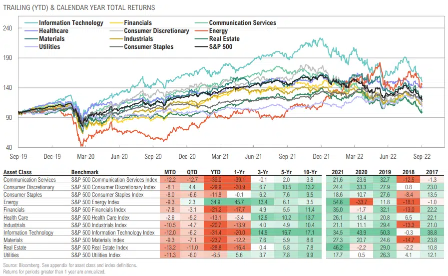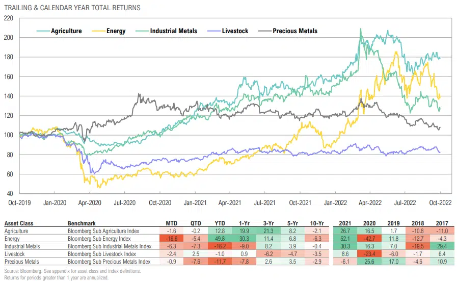All commodities sold off in September with energy, the biggest loser, down -16.6%; industrial and precious metals were underperformers QTD, while livestock managed to eke out +2.5%