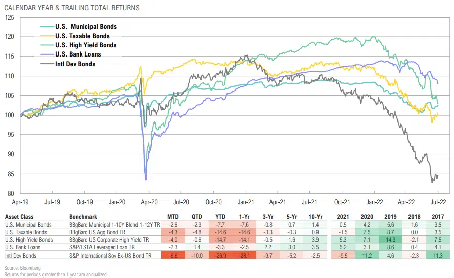 Most U.S. fixed income and credit asset classes were down over the quarter; international developed bonds faired the worst and are now down over the last decade