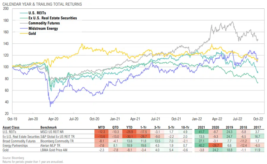While energy gave back returns in September, it was the only area of the real assets and infrastructure category to be up in Q3; REITs continue to struggle in the rising rate environment