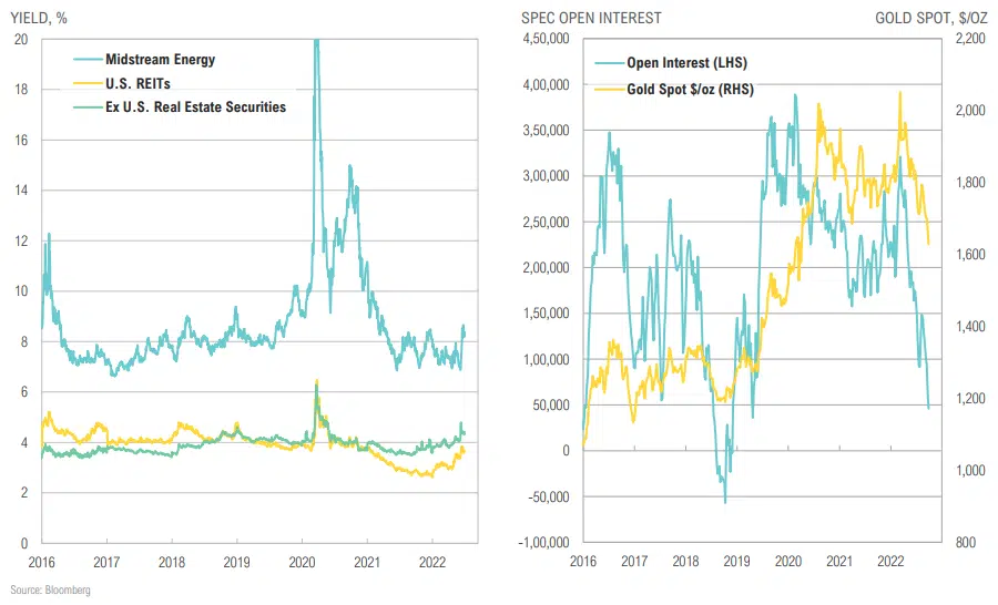 Midstream yield premium remains intact; gold speculative futures positioning is low enough that upside potential is building, but gold will likely continue to struggle if rates move higher
